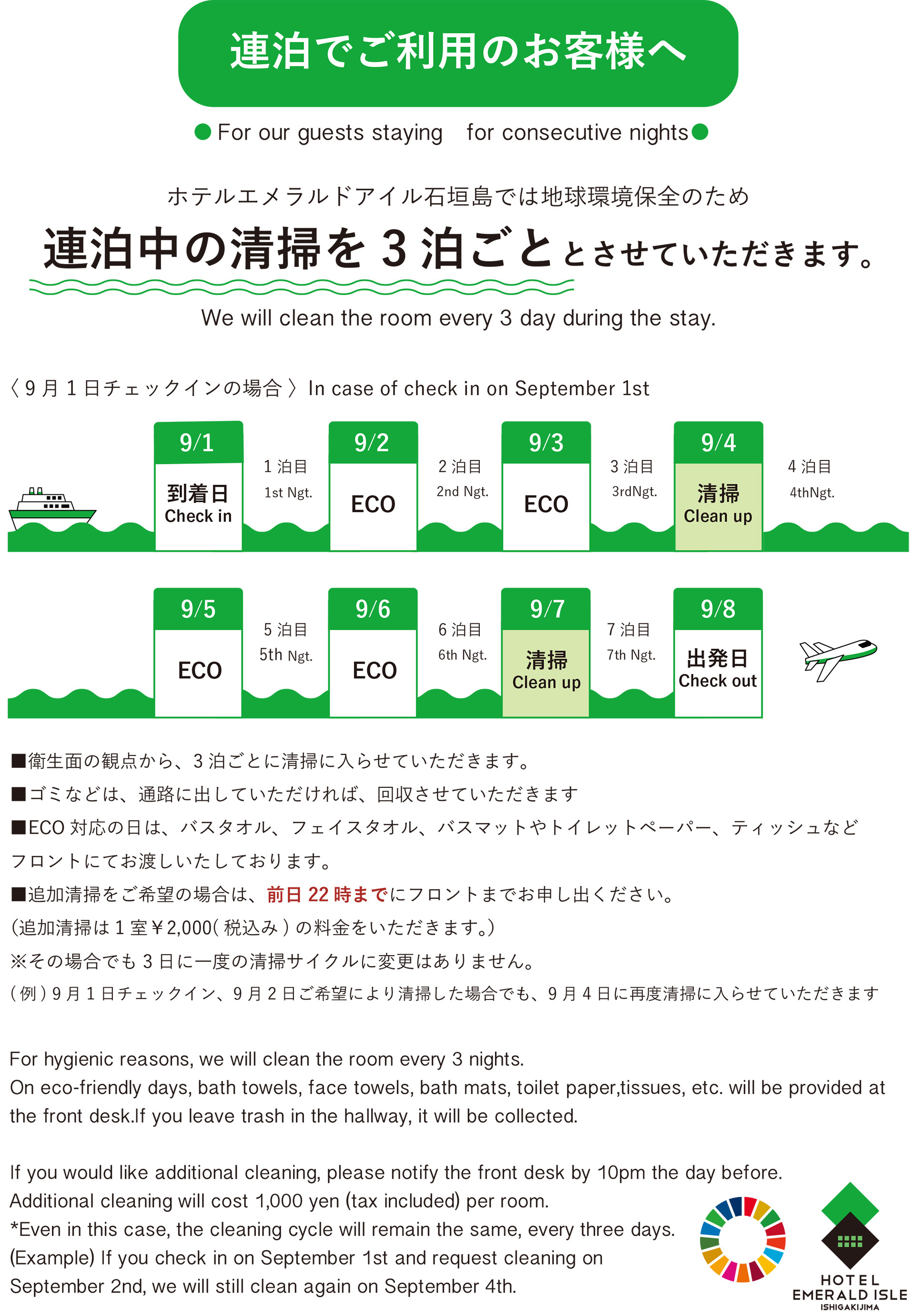 2025年10月1日より実施 平素よりホテルエメラルドアイル石垣島をご愛顧賜り誠に有難うございます。 この度、当ホテルでは環境保全への取り組みの一環として、滞在中の客室清掃を原則として3日ごとのルーム清掃と変更させていただくこととなりました。 これにより、 ・洗剤や電力、水道の使用量の削減 ・ゴミの排出量の抑制 ・二酸化炭素排出の削減 など、持続可能な観光の実現に貢献してまいります。 ご宿泊予約 HOME CONCEPT ROOMS CAFE & BAR EVENT SPACE ACCESS 宿泊予約